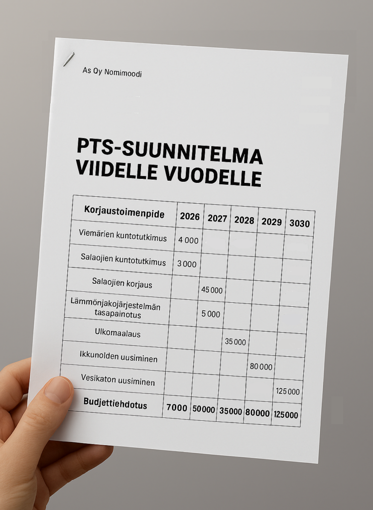 Pitkän tähtäimen suunnitelman raportti on PTS-asiakirja. Suunnitelman tekemiseksi tarvitaan lähtötietoja rakennuksesta. Rakennus yleensä edellyttää myös sen järjestelmien katselmointia, jotta rakennuksesta sekä sen korjaustarpeista muodostuu selkeä, täsmällinen ja ajantasaisen kuva. PTS-suunnitelma kannattaa teettää ammattilaisella, joka ymmärtää teknisten järjestelmien toimintaa ja rakenteiden fysiikkaa. Mikäli tarvitset PTS-asiakirjan, voin laatia sellaisen näin sovittaessa.